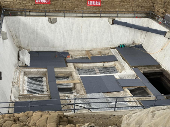 2020年9月起,一號(hào)墓發(fā)掘工作開始。至2023年11月,完成封土和填土發(fā)掘,12月提取了槨室上鋪設(shè)的竹席。這期間,建設(shè)了一號(hào)墓現(xiàn)場保護(hù)大棚和文物庫房、文物保護(hù)實(shí)驗(yàn)室、宿舍等必要的配套設(shè)施。2024年3月7日開始拆解提取槨蓋板,至3月27日,四層槨蓋板已全部安全提取完成,共計(jì)443根,總重約153噸?,F(xiàn)已進(jìn)入槨室發(fā)掘第二階段,即槨室內(nèi)部的發(fā)掘清理。