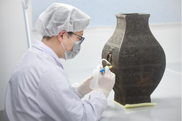 考古人員對(duì)出土青銅器進(jìn)行保護(hù)清理
